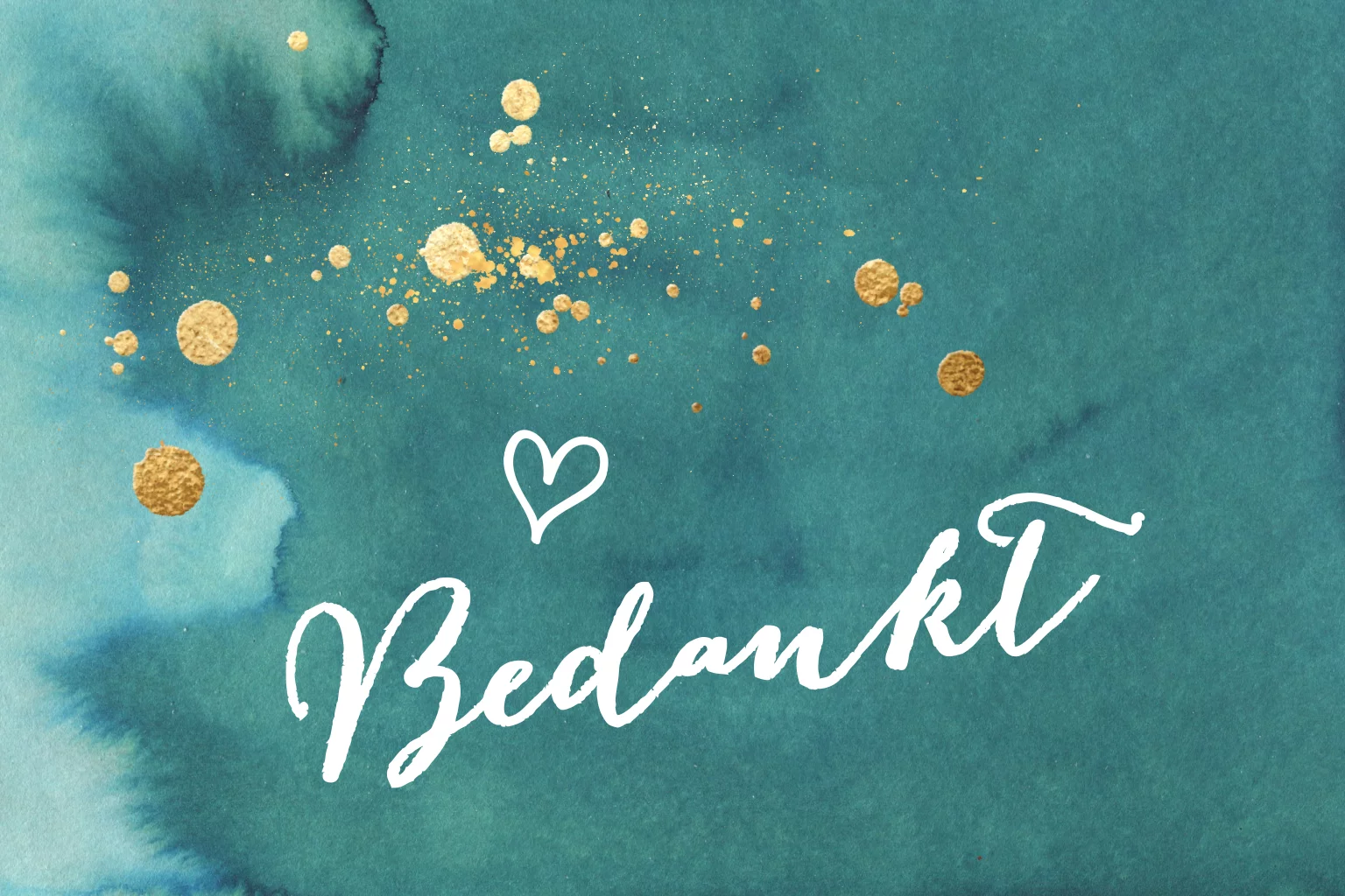 Bedank iedereen die aanwezig was op jullie huwelijk met dit stijlvolle bedankkaartje met mooie ineenlopende zeegroene watercolour tinten. Aan de buiten en binnenkant staan mooie gouden verfspetters.