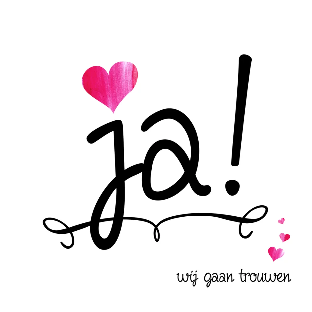 Hippe bruiloft uitnodiging wit met het woord JA! en hartjes. Trendy trouwkaart van Luckz.