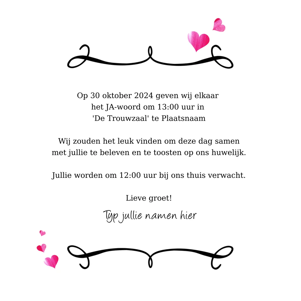 Laat iedereen weten dat jullie gaan trouwen met deze strakke bruiloft uitnodigingskaart. JA! Het is voor iedereen duidelijk dat dit de grote dag uit jullie leven wordt dus iedereen mag komen. Op de voorkant staat de tekst Ja! wij gaan trouwen!. Plaats aan de binnenkant van de trouwkaart tussen de prachtige ornamenten een unieke uitnodigingstekst en laat het feest beginnen.