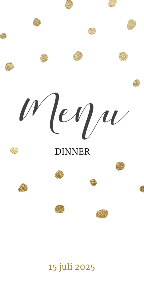 Stijlvolle en chique menukaart voor jullie bruiloft met witte achtergrond en gouden confetti waarmee jullie het menu van jullie diner kunnen vermelden.