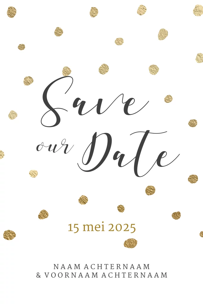 Laat iedereen weten wanneer jullie gaan trouwen met deze stijlvolle en chique Save the Date kaart met witte achtergrond en mooie gouden confetti.