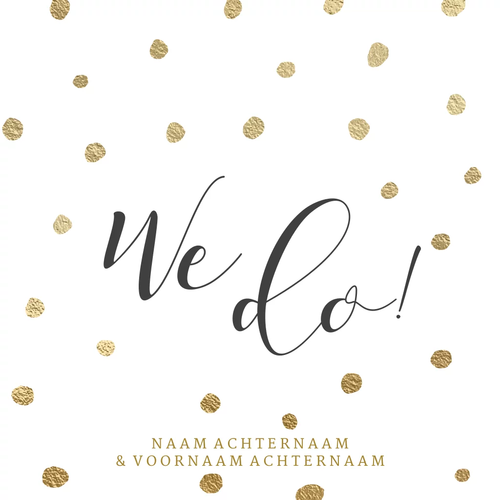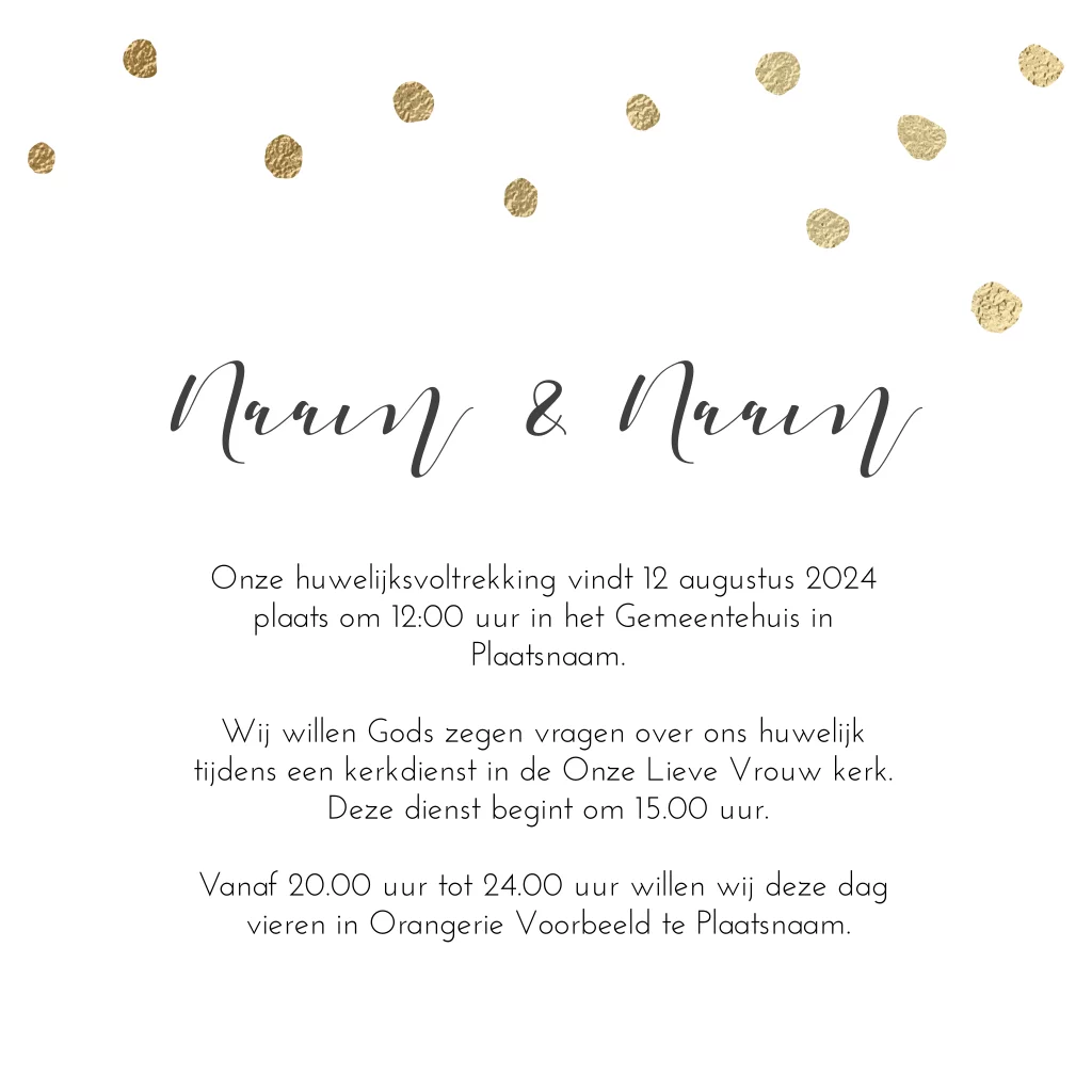 Chique en stijlvolle trouwkaart voor jullie bruiloft met gouden confetti op een witte achtergrond met mooie typografie. Maak deze trouwkaart uniek en pas de teksten en kleuren aan naar wens.