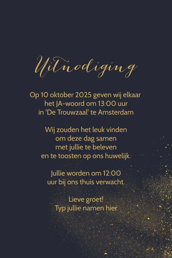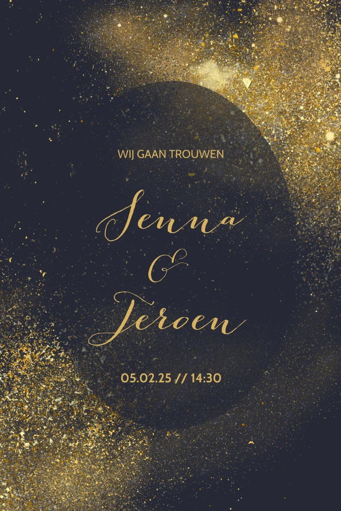 Een chique en schitterende trouwkaart met donkere achtergrond en sfeervolle gouden sterrenstof en stardust effect rondom de uitnodiging. Met goud look typografie. De lettertypes, teksten en kleuren zijn allemaal aan te passen.