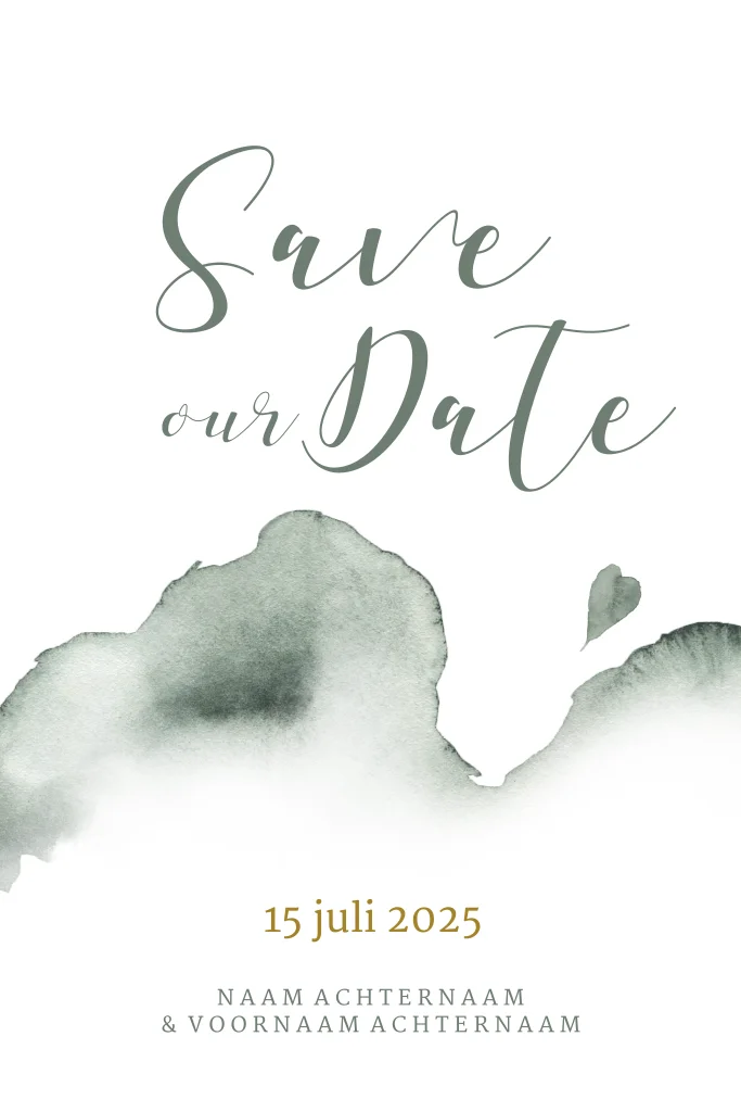 Een mooie en hippe aankondiging voor jullie bruiloft met groene aquarel verf vlekken op een witte achtergronden stijlvolle typografie met de tekst Save our date en de datum. Stijlvolle save the date kaart van Luckz.