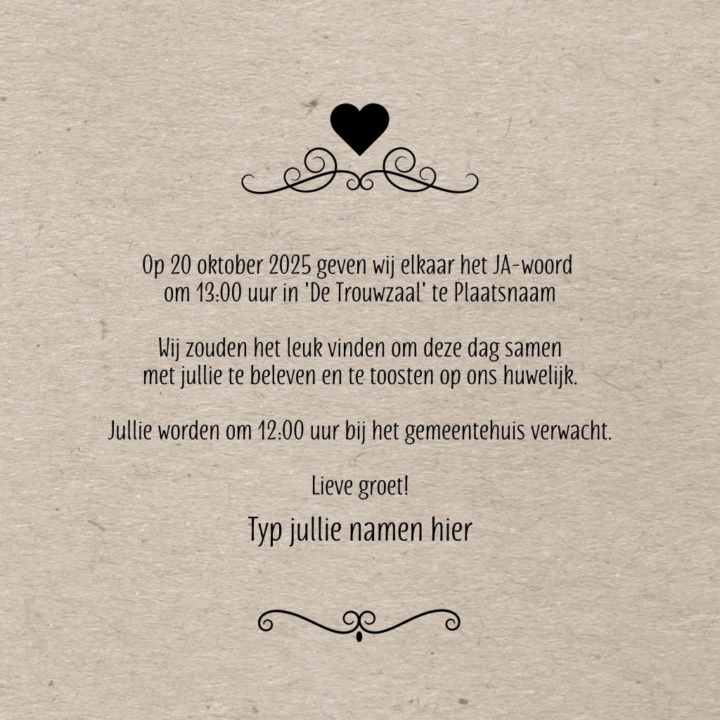 Hippe krijtbord trouwkaart voor jullie bruiloft met krijtbord achtergrond, witte typografie en teksten die je zelf kan aanpassen en personaliseren.