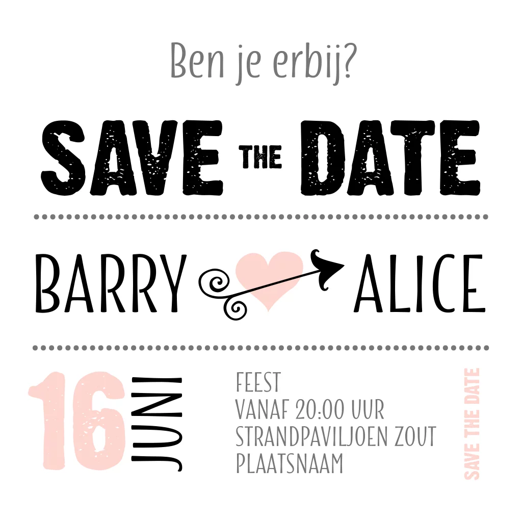 Hippe Save the Date kaart met speelse typografische letters. Laat iedereen weten welke dag ze voor jullie trouwdag moeten reserveren.