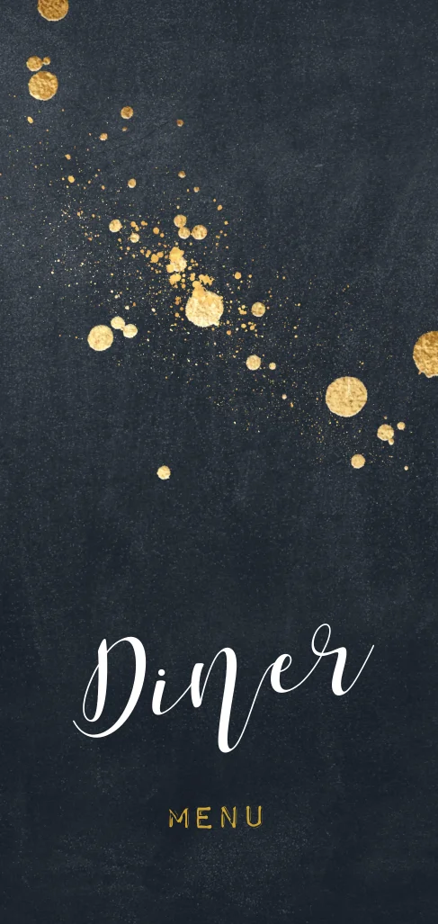 Deze menukaart kun je helemaal zelf aanpassen en ontwerpen. Met stijlvolle zwarte krijtbord sfeer achtergrond en kleine gouden spettertjes en hippe typografie.