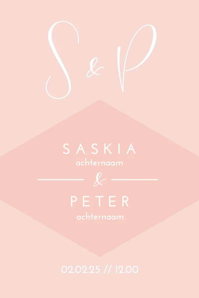 Mooie moderne trouwkaart met lichtroze tinten en kleuren en witte typografie en geometrisch vlak.