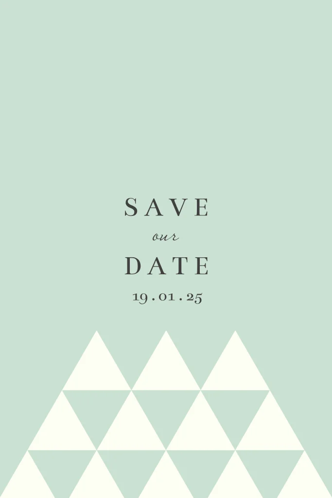 Mooie Save the Date kaart met kleine geometrische off-white driehoekjes op een mint groene achtergrond en stijlvolle typografie.