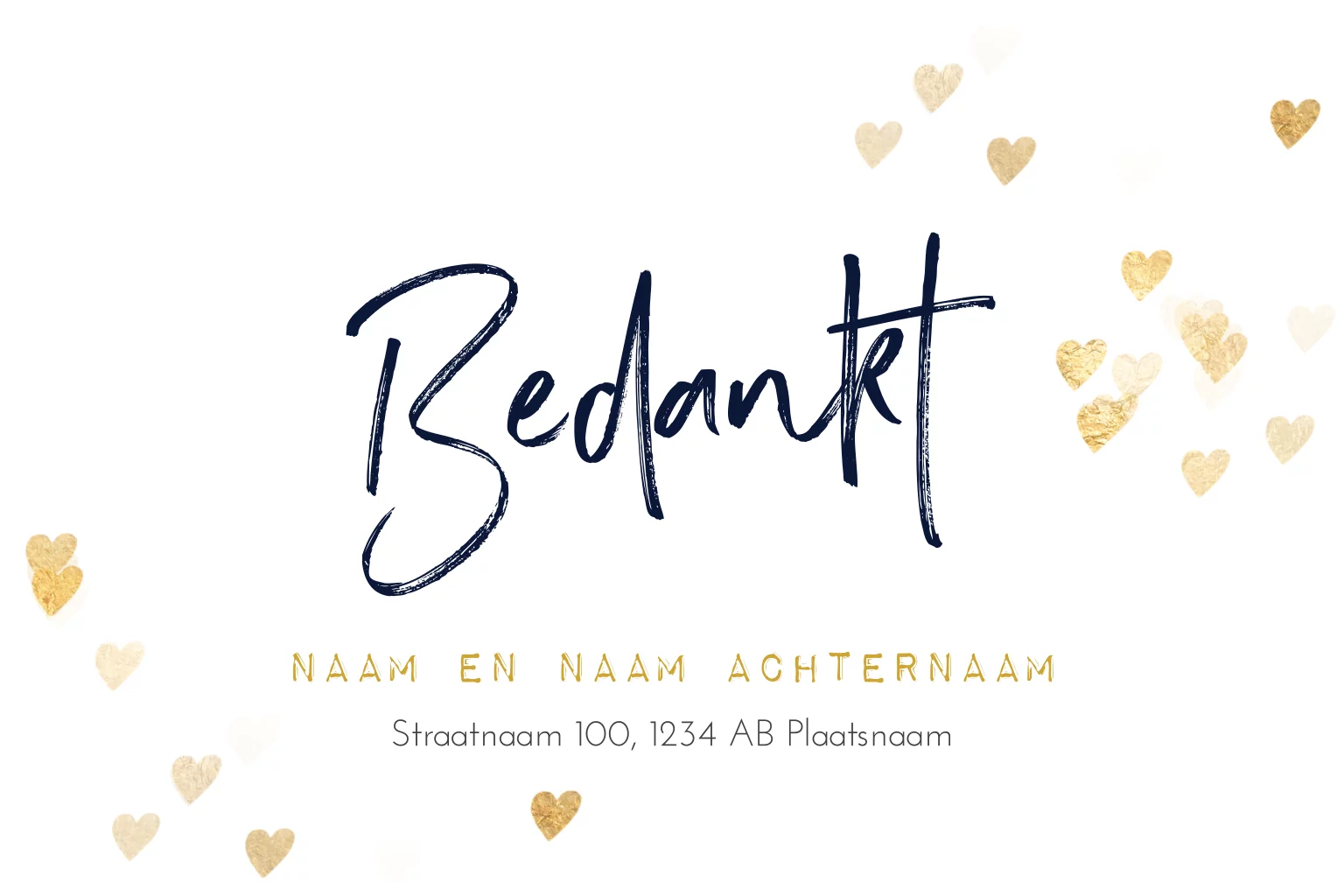 Maak zelf dit bedankkaartje van jullie trouwdag om vrienden familie die op jullie trouwdag waren te bedanken voor een prachtige dag. Met stijlvolle witte achtergrond met kleine gouden hartjes en hippe typografie op de voorkant.