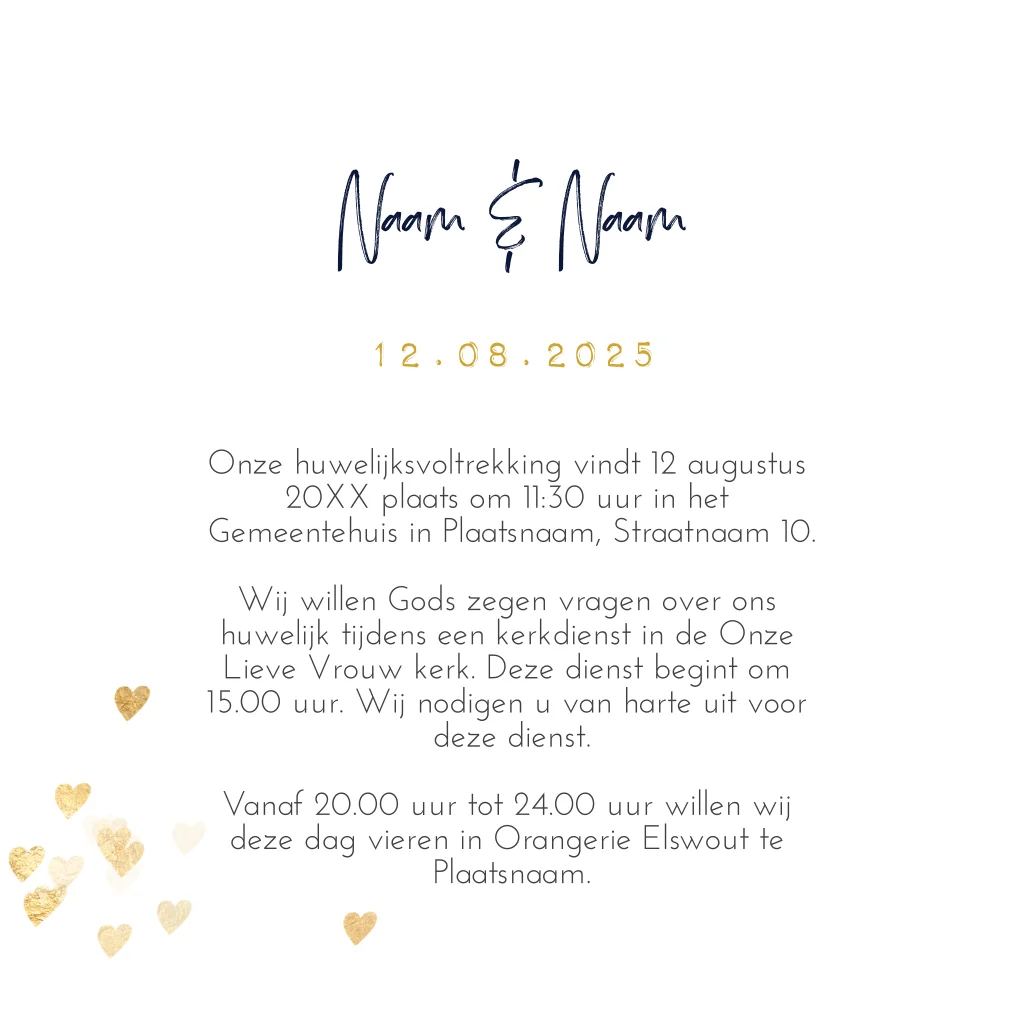 Trendy trouwkaart met mooie donkere kleur en kleine gouden hartjes, een super trendy en stijlvolle combinatie. Schrijf je persoonlijke teksten, kies de kleuren en maak zelf dit trouwkaartje voor jullie bruiloft.