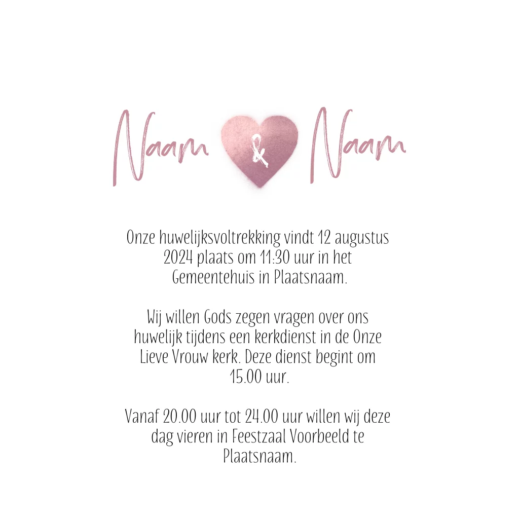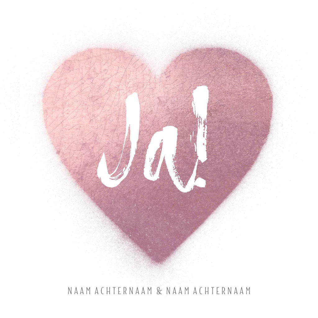 Nodig iedereen uit voor jullie trouwfeest met deze mooie trouwkaarten, met een groot hart met roze structuur op een witte achtergrond. Daarop groot het woord Ja!
