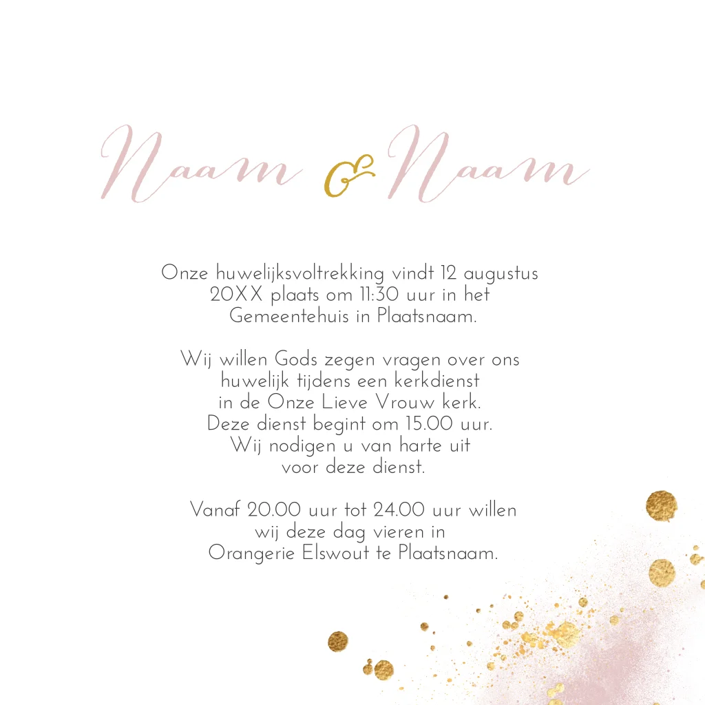 Ontwerp zelf deze chique trouwkaart met kleine goud spettertjes. De achtergrond en kleuren kun je zelf eventueel aanpassen, net als alle teksten. Ontwerp zo zelf jouw eigen unieke trouwkaartje voor jullie speciale dag.