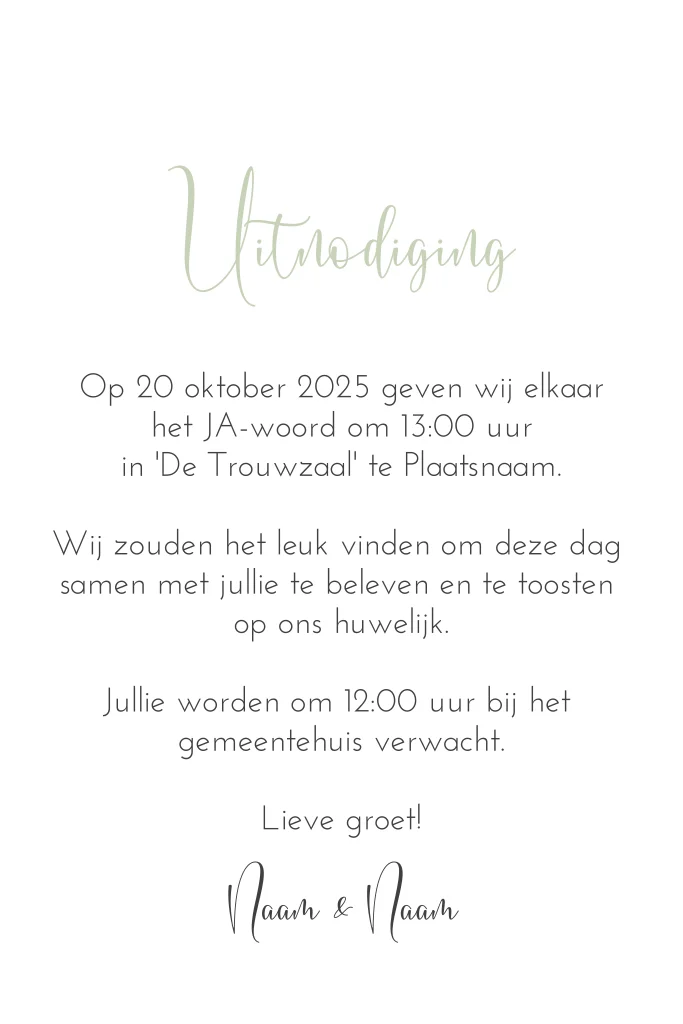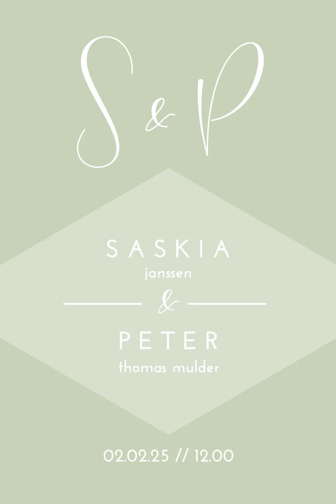 Mooie geometrische trouwkaarten die je zelf kan maken met lichte olijf groene kleuren en witte typografie.