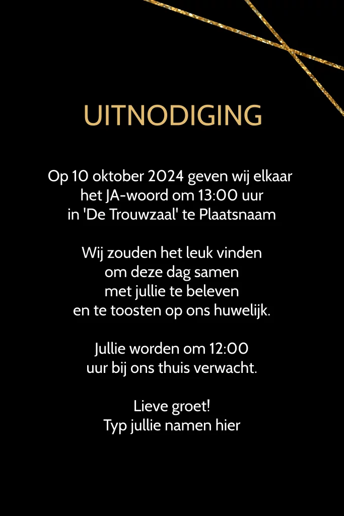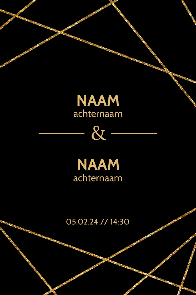 Chique trouwkaart met zwarte achtergrond en gouden strakke geometrische lijnen. Ontwerp zelf deze huwelijksuitnodiging en pas teksten en kleuren aan naar wens.