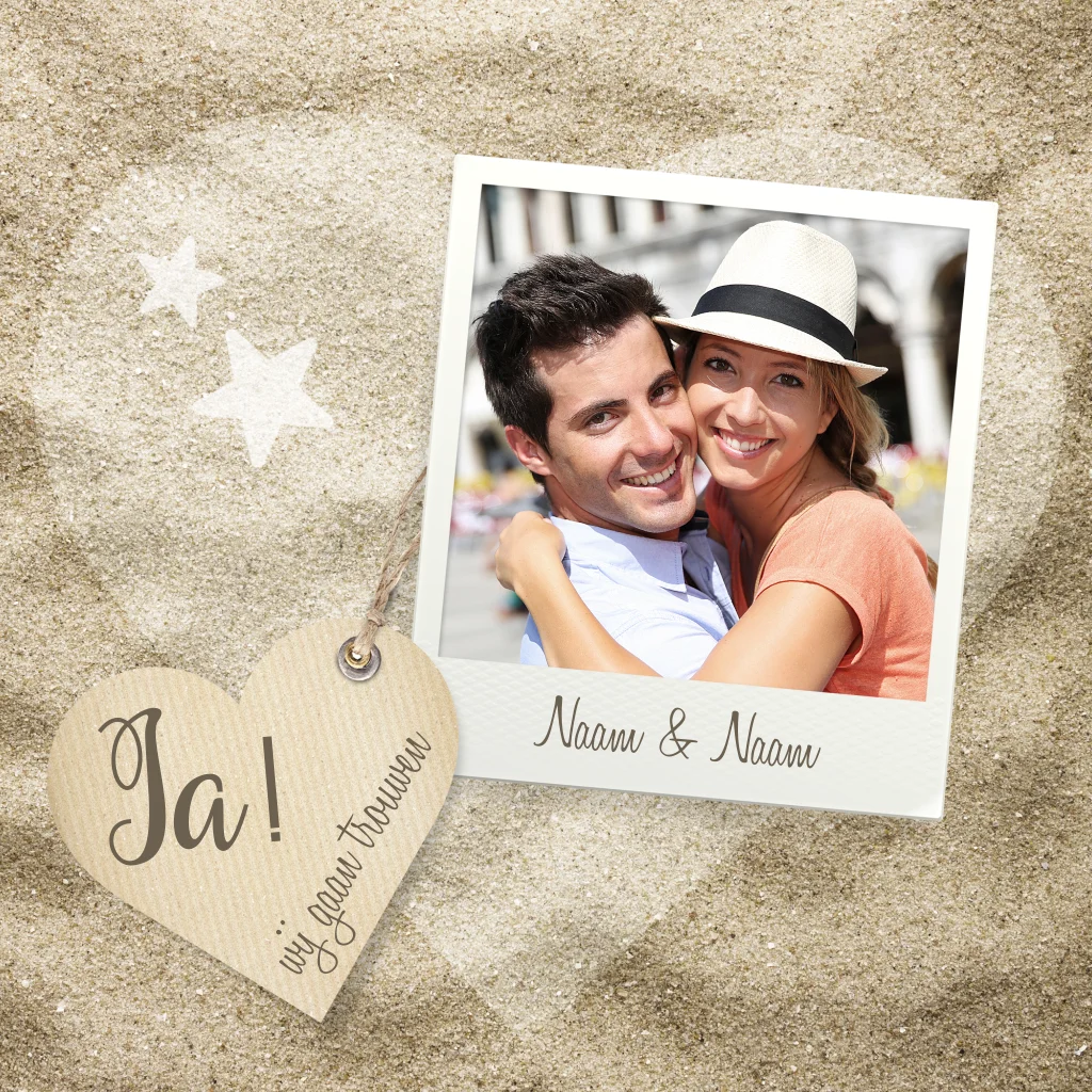 Gaan jullie trouwen op het strand? Maak zelf deze leuke trouwkaart voor een trouwerij op het strand. Voeg een foto van jullie toe en plaats deze achter de zand achtergrond met een leuk wit fotoframe.