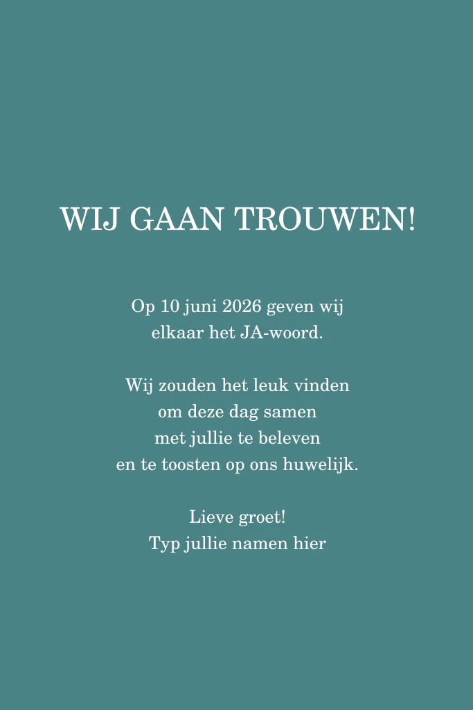 Wil je graag een andere kleur? Deze trouwkaarten met de datum en jaartal zoals 2026 op de voorkant zijn compleet te personaliseren. Kleuren, namen, lettertypes en teksten.