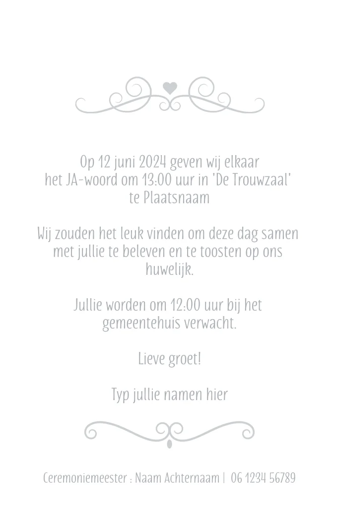 Een stijlvolle uitnodiging voor jullie bruiloft, met een grijze achtergrond en wit label op de voorkant. Maak jullie eigen trouwkaart en pas de teksten en kleuren aan naar wens.