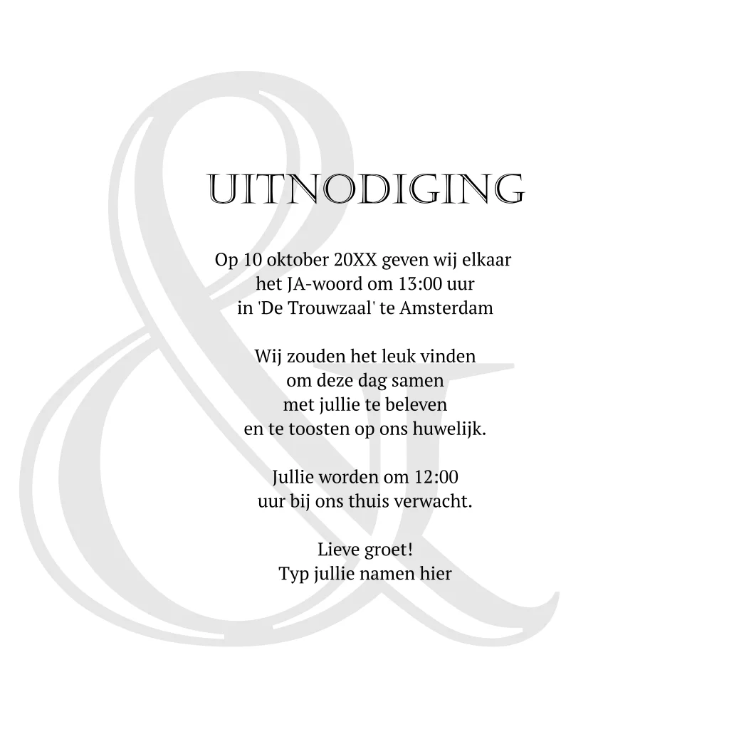 Alle zwart-witte kleuren, lettertypes, namen en teksten zijn te personaliseren. De achtergrond met ampersand tekens kun je laten staan of weghalen. Pas de trouwkaart aan naar wens!