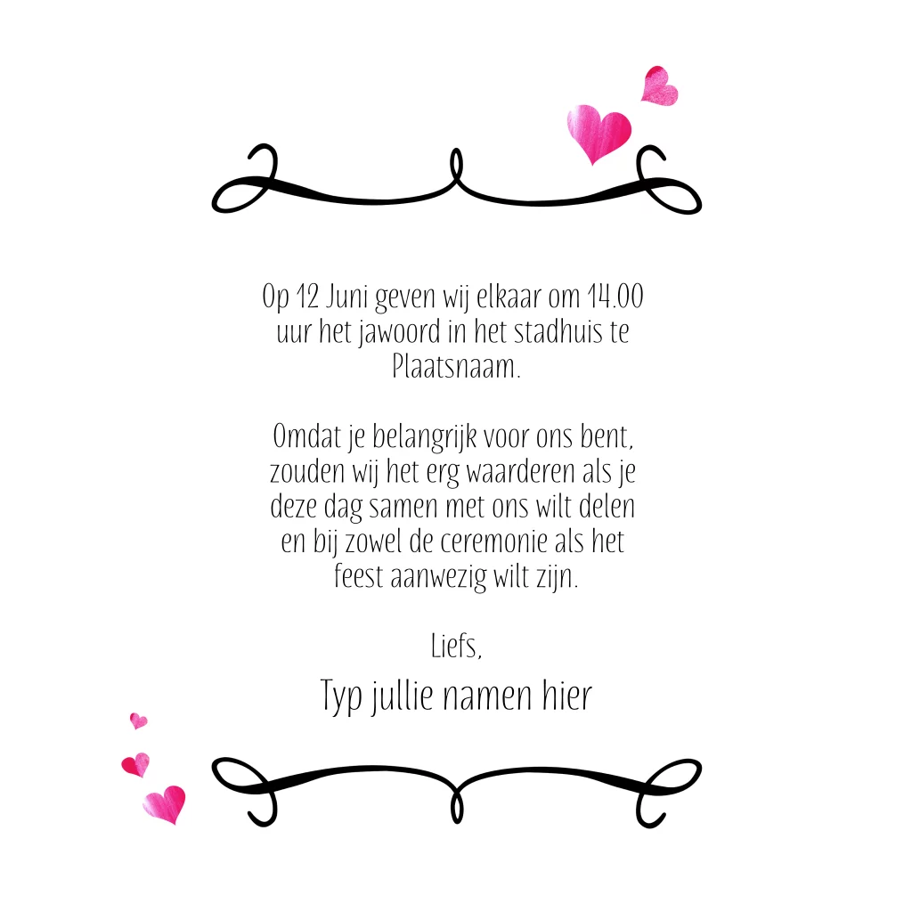 Maak samen een trendy en uniek trouwkaartje met hippe strepen van wit en grijs (kleuren zijn aanpasbaar) leuke roze hartjes en natuurlijk het woord JA! Maak met de editor de trouwkaart echt speciaal, schrijf een leuke uitnodigingstekst voor jullie grote dag en maak er met familie en vrienden een groot feest van!