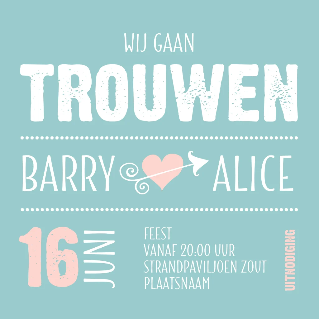 Laat iedereen weten dat jullie gaan trouwen met deze hippe bruiloft uitnodiging. Maak zelf je eigen trouwkaart en pas de kleuren en teksten aan naar wens. Op de voorkant staat de tekst "Wij gaan trouwen" met jullie namen, datum en de locatie.