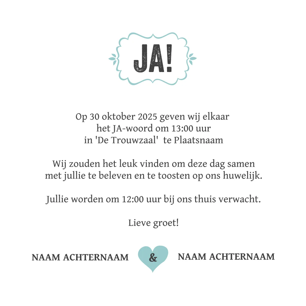 Alles op deze uitnodigingen voor jullie bruiloft kun je zelf eenvoudig personaliseren bij Luckz.