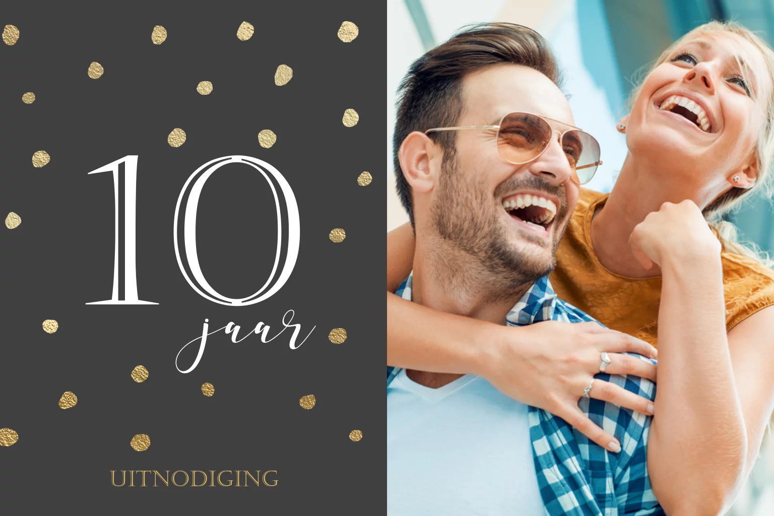 Op deze enkelzijdige jubileum uitnodiging staat vrolijke gouden confetti stippen op een donker grijze achtergrond en aan de rechterkant kun je zelf gemakkelijk je eigen foto plaatsen.