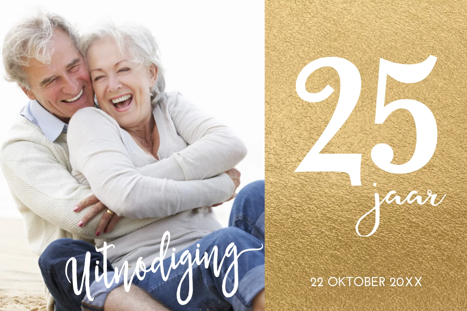 Nodig iedereen op een originele wijze uit met deze stijlvolle uitnodiging als jullie 25 jaar getrouwd zijn. Met een mooie chique goud look effect en een eigen foto op de voorkant.