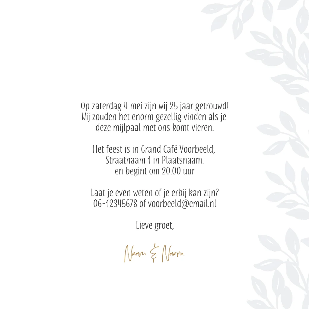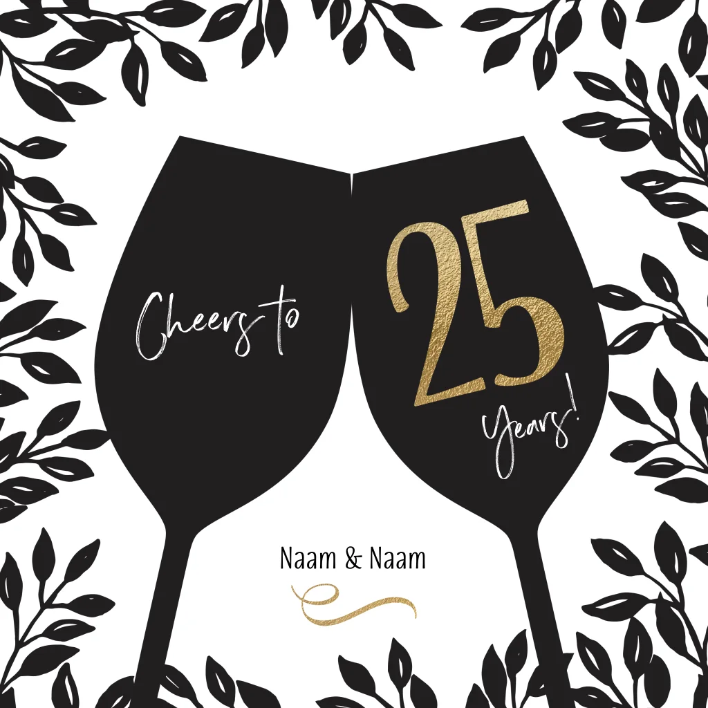 Een mooie en feestelijke uitnodiging voor jullie 25-jarig jubileum met proostende wijnglazen silhouet met "cheers to 25 years". Nodig iedereen uit voor een feestelijk jubileum diner of feest en maak zelf deze mooie uitnodiging voor jullie jubileum van 25 jaar bij Luckz en pas de kleuren en uitnodigingsteksten aan.