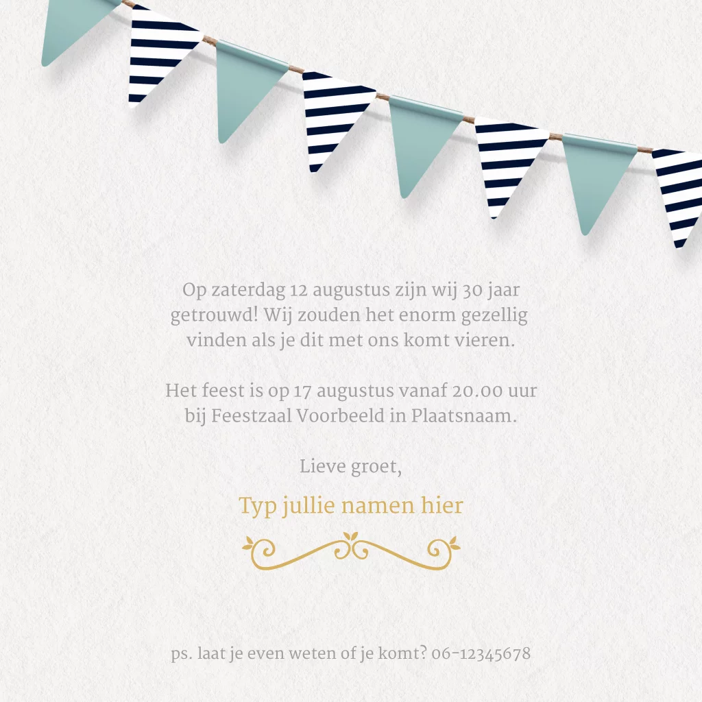 Een feestelijke uitnodiging voor een dertig jarig huwelijksjubileum feest. Met sierlijke 30 jaar cijfers op een krijtbord look achtergrond. Extra feestelijk door de vlaggetjes en versiering.