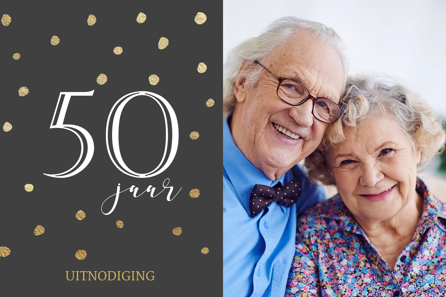 Nodig al je vrienden en familie uit voor een knalfeest ter ere van jullie 50-jarig huwelijk samen. Op deze enkelzijdige uitnodigingskaart staat vrolijke gouden confetti stippen op een donker grijze achtergrond en aan de rechterkant kun je zelf gemakkelijk je eigen foto plaatsen.