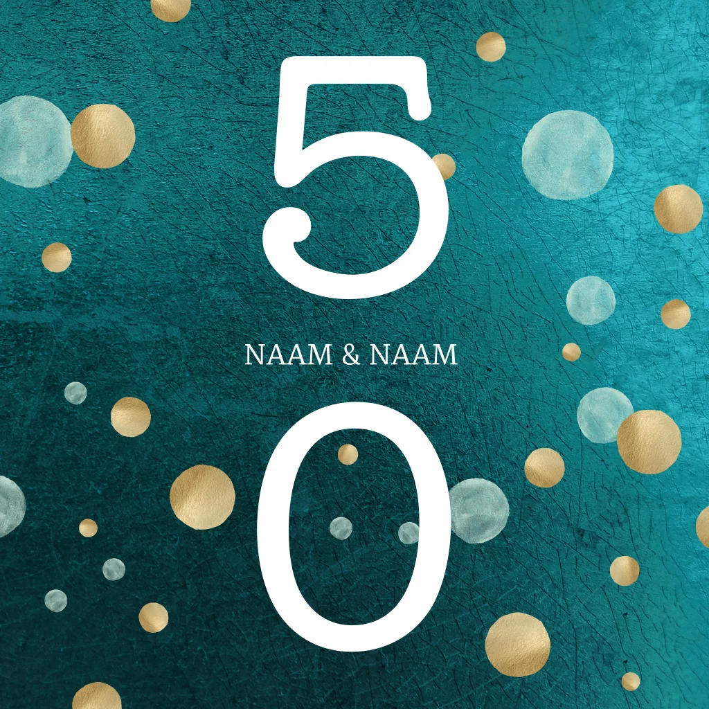 Een originele typografische huwelijksjubileum uitnodiging voor een vijftigjarig huwelijksfeest met een mooi petrol groene achtergrond, groot in witte typografie het getal 50 en feestelijke goud en licht groene stippen rondom.