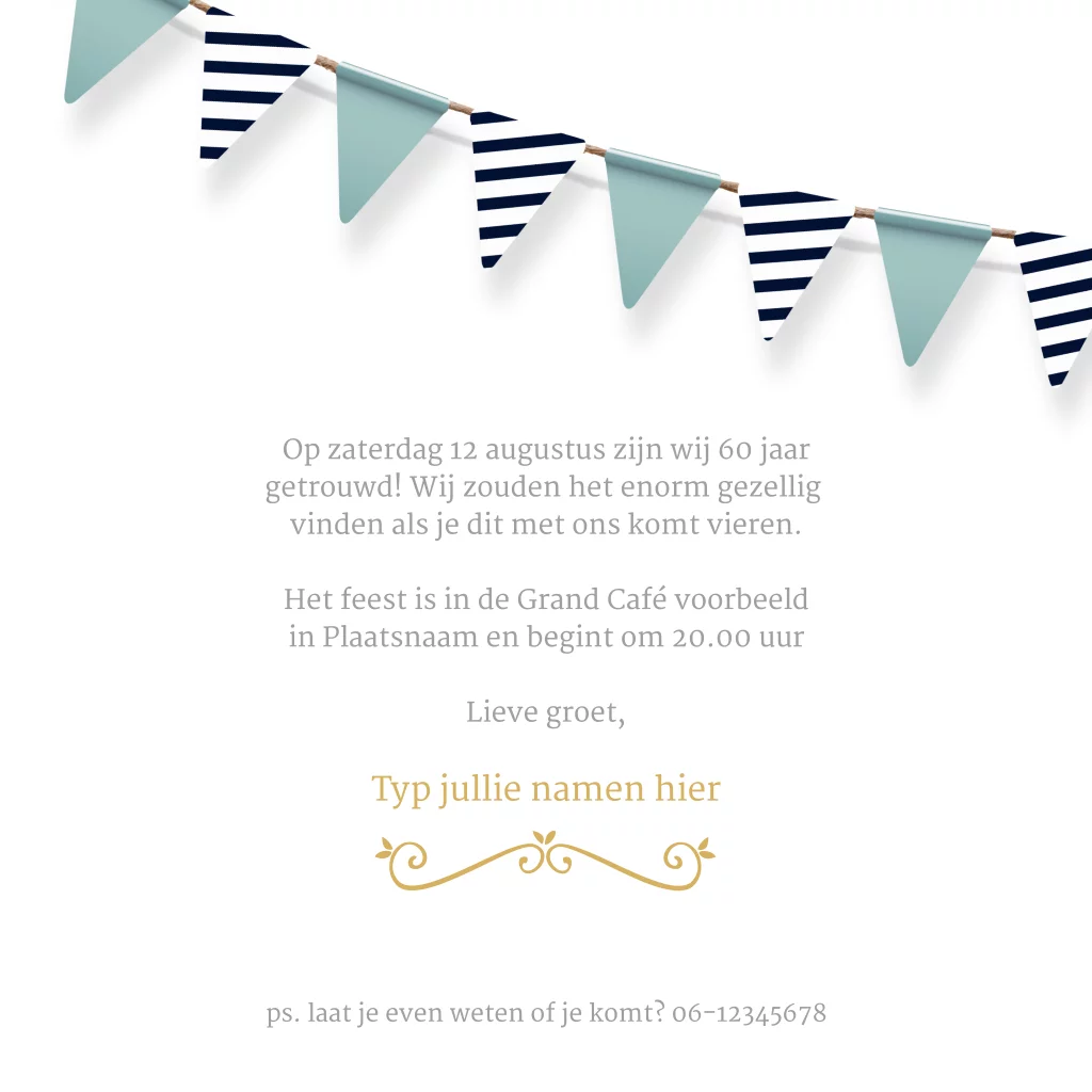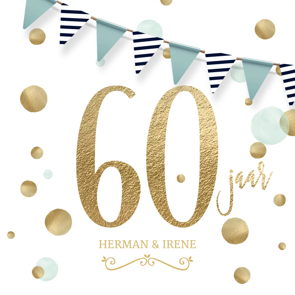 Feestelijke jubileum uitnodiging voor 60 jaar getrouwd. Met groot een gouden 60 jaar getal, mooie blauwe vlaggetjes en goud blauwe verf effect stippen en op een witte achtergrond. Alle design elementen komen ook weer terug aan de binnenkant van de uitnodigingskaart.