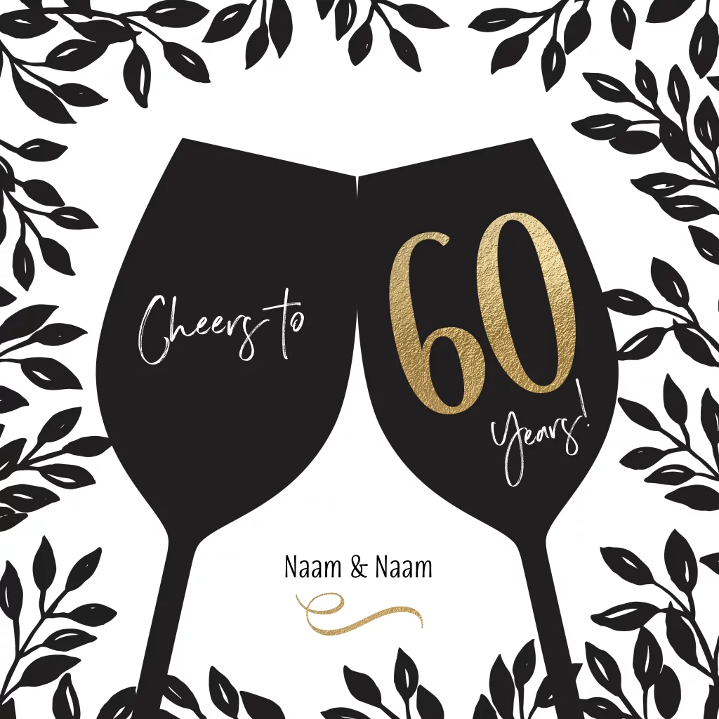 Deze jubileum uitnodiging heeft een silhouet van proostende wijnglazen op een witte achtergrond en de tekst "cheers to 60 years".