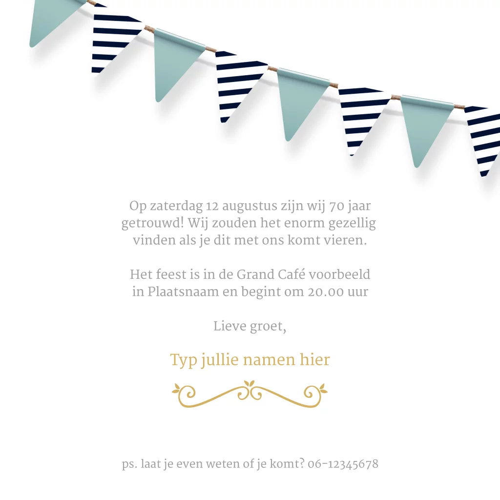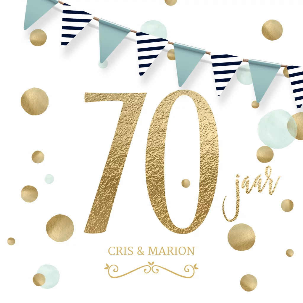 Met groot een gouden 70 jaar getal, mooie blauwe vlaggetjes en goud blauwe verf effect stippen en op een witte achtergrond. Alle design elementen komen ook weer terug aan de binnenkant van de uitnodigingskaart.