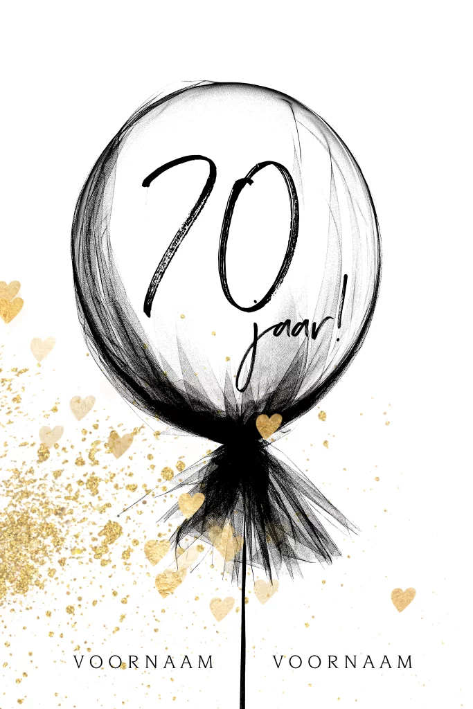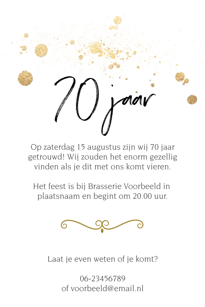 Bewerk deze mooie jubileum uitnodiging voor een 70-jarig huwelijksjubileum (jaartal is aanpasbaar) met een mooie zwarte doorzichtige ballon op een witte achtergrond met sfeervolle goud spetters aan de buiten en binnenkant.