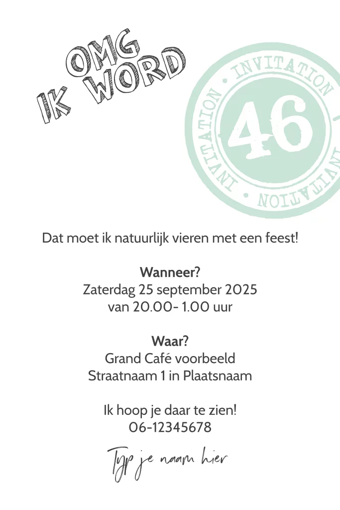 Een grappige uitnodiging voor een verjaardag waar je zelf een leeftijd getal kan invullen.