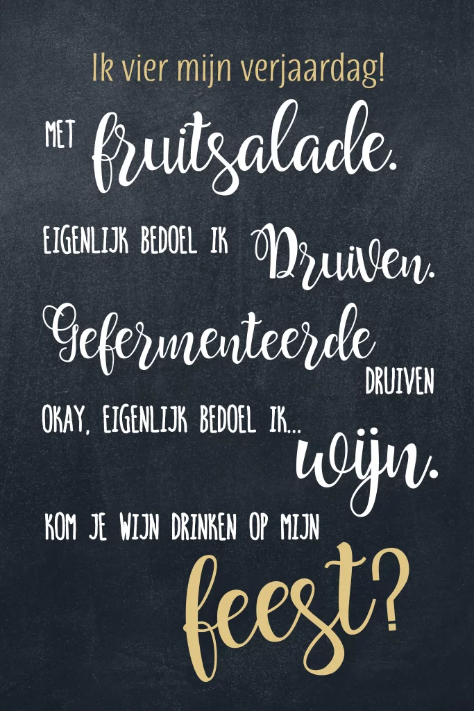 Maak deze unieke en grappige uitnodiging voor bijvoorbeeld een wijnproeverij verjaardagsfeest of een gezellige party waar wijn wordt geschonken.