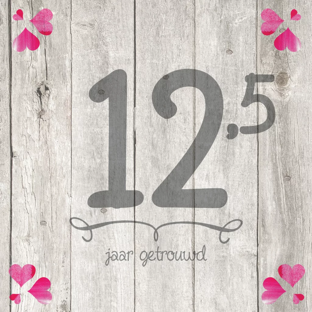 Nodig alle familie en vrienden uit voor een geweldig jubileumfeest voor jullie 12,5 jarig huwelijksjubileum. Deze uitnodiging heeft een modern houten achtergrondje met leuke roze hartjes. Aan de binnenkant kun je de datum zetten en een originele uitnodigingstekst schrijven.