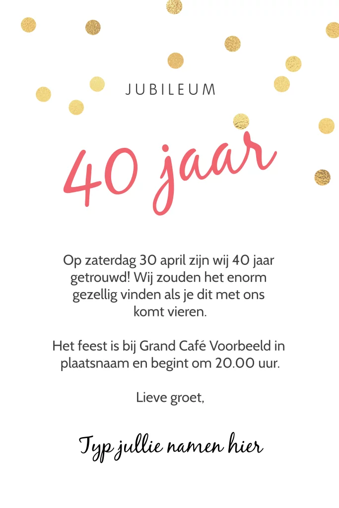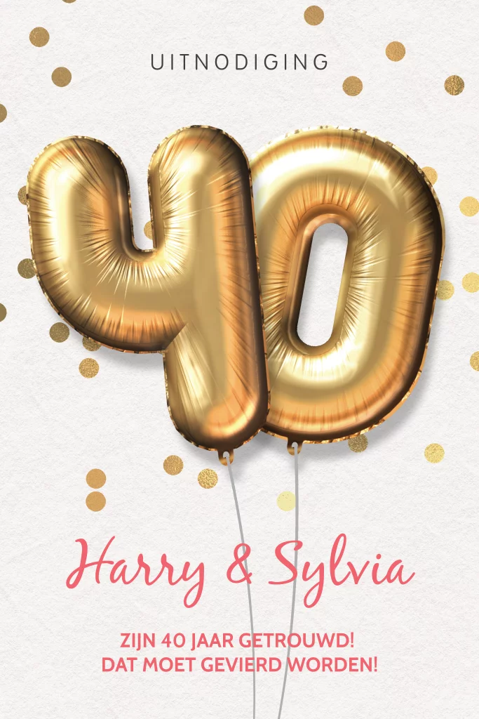 Ontwerp zelf en stuur deze feestelijke huwelijksjubileum uitnodiging met gouden ballonnen 40 jaar getrouwd naar alle gasten.