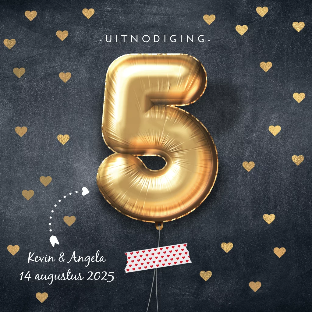 Maak deze feestelijke uitnodiging voor jullie 5-jarig jubileum. Met een hippe gouden ballon op een krijtbord look achtergrond en kleine gouden hartjes rondom. En een eigen foto van jullie zelf aan de binnenkant.
