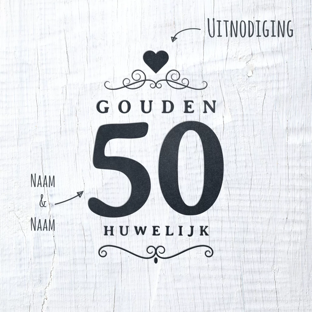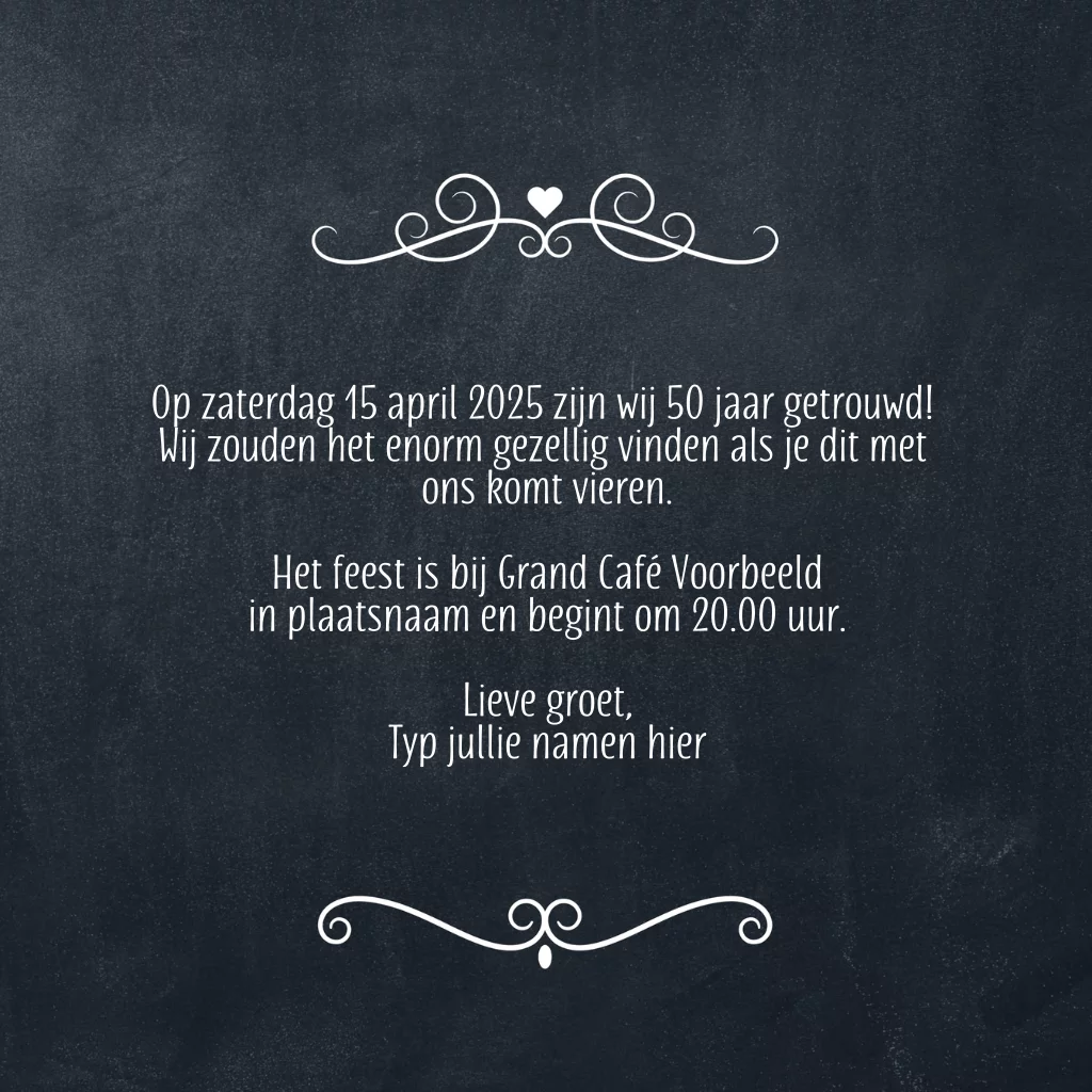 Nodig iedereen uit in stijl met deze trendy jubileum uitnodiging voor 50 jaar. Op een mooie witte houten achtergrond staat een mooi ornament met 50 jaar gouden huwelijk. De binnenkant is bedekt met een krijtbord structuur waar je alle teksten zelf kan aanpassen.