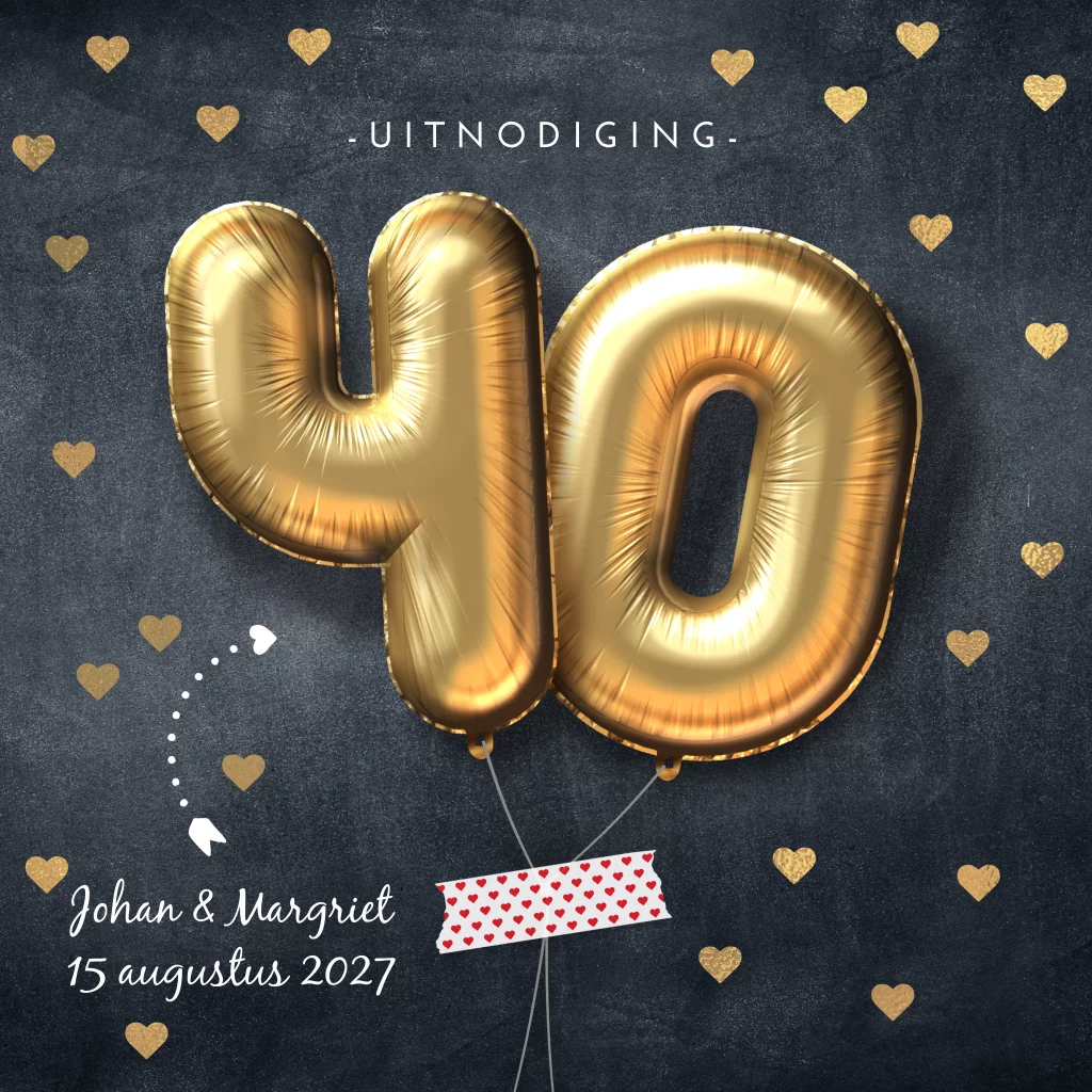 Een feestelijke jubileum uitnodiging met gouden 40 jaar huwelijksjubileum ballonnen op de een hippe krijtbord look achtergrond. Met rondom kleine gouden hartjes. In de binnenkant kun je een foto toevoegen.