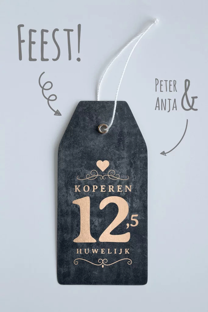 Stijlvolle jubileum uitnodiging voor een 12,5-jarig huwelijk met een chique witte achtergrond, donker label met koperen huwelijk embleem. De binnenkant is geheel van krijtbord textuur waar het koperen 12,5 jaar getrouwd embleem terugkomt met aan de rechterkant een zelf aan te passen uitnodiging tekst.