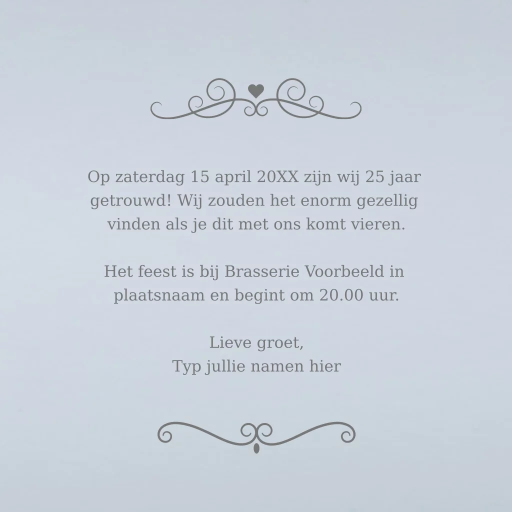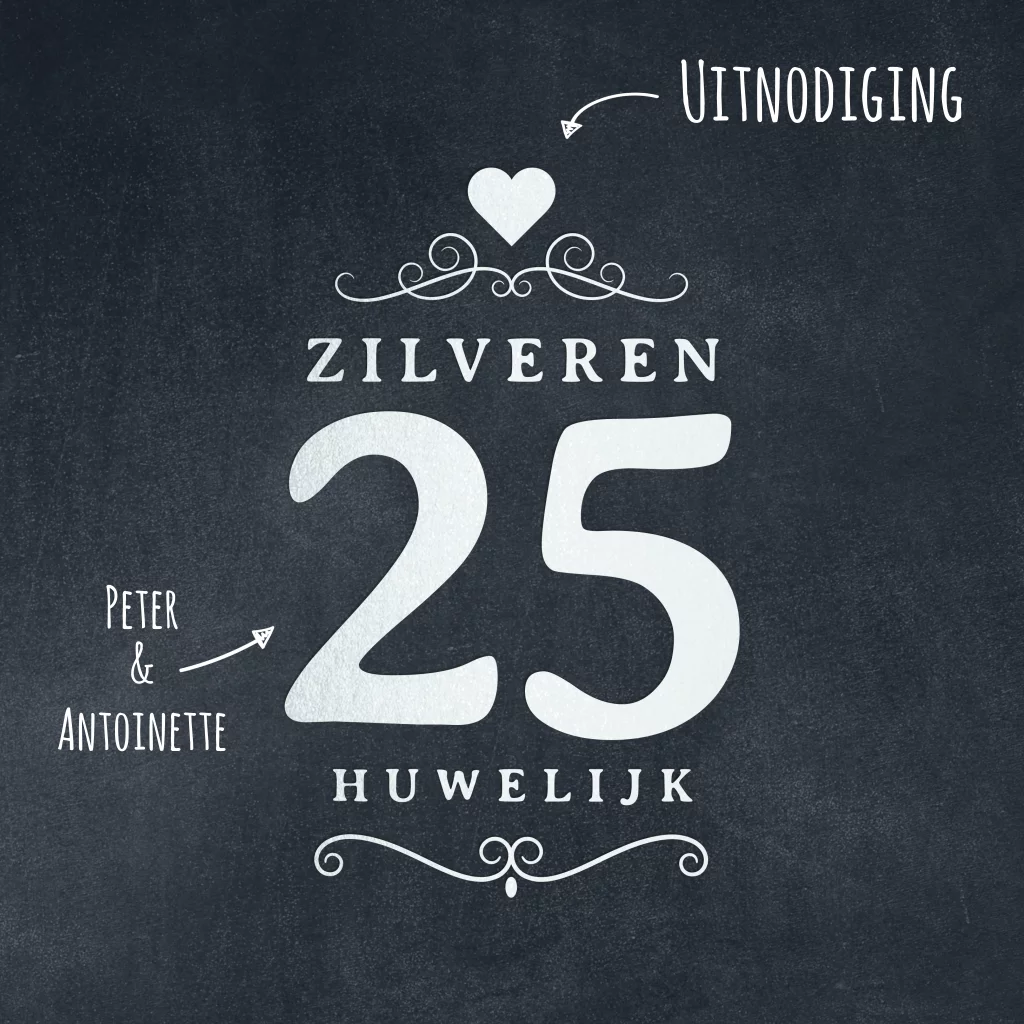 Op de voorkant van de uitnodiging staat de tekst "Zilveren 25 huwelijk" in een zilveren kleur. Met daarnaast de namen van jullie beiden. Dit strakke ontwerp heeft aan de binnenkant een witte achtergrond met daarop een label van krijtbord en ruimte voor de datum en tijd van het jubileumfeest.