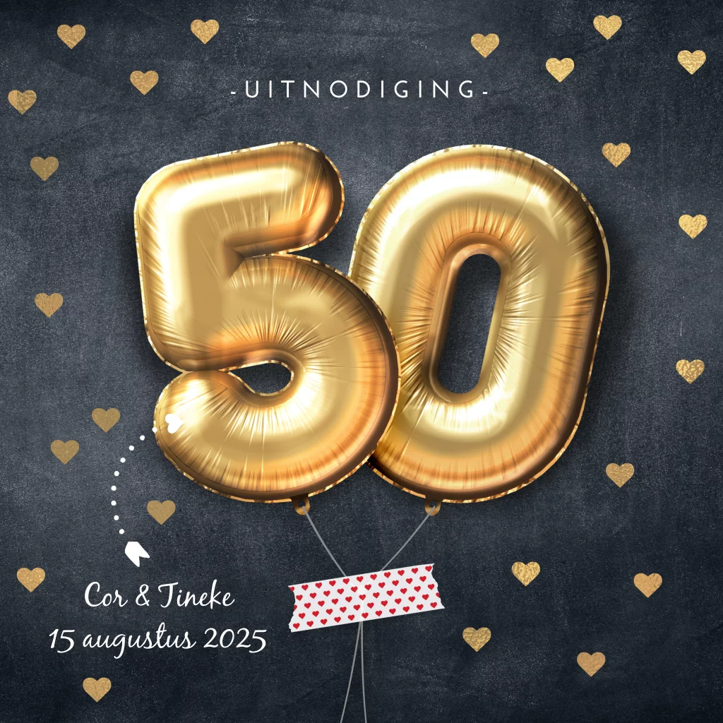 Maak zelf deze originele 50-jarig jubileum uitnodiging met gouden ballonnen op een donkere achtergrond met een leuke eigen foto aan de binnenkant. Pas deze uitnodiging gemakkelijk zelf aan met de editor, kleuren, teksten en foto's.