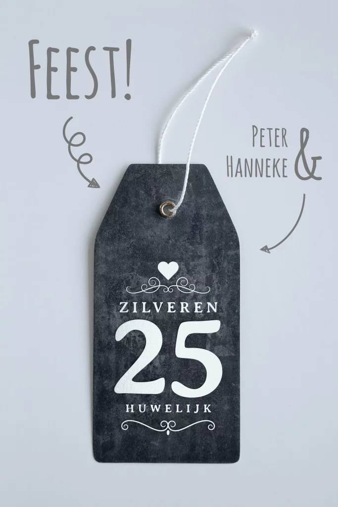 Op een witte achtergrond springt het label van krijtbord met zilveren tekst uit de uitnodigingskaart. Op het label staat de tekst zilveren 25 huwelijk met daarnaast jullie namen.