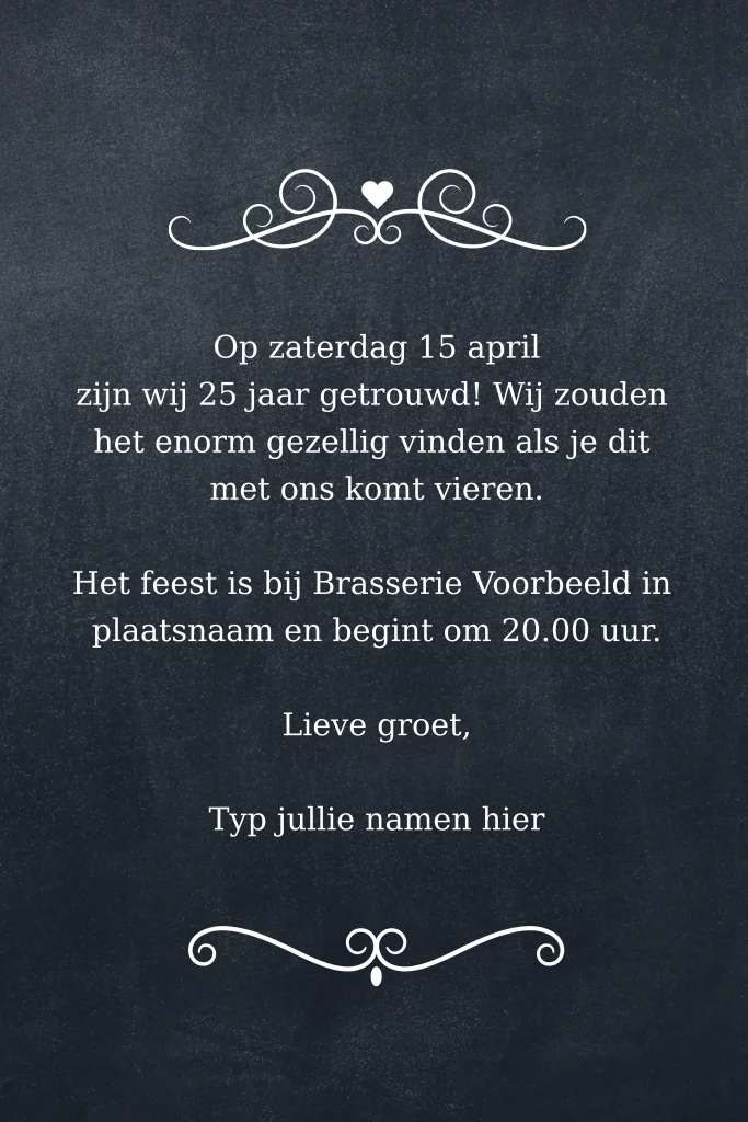 Deze moderne jubileum uitnodiging heeft van binnen een geheel gevulde krijtbord achtergrond waar je links tussen de leuke witte ornamenten de datum en tijd aan kan zetten van het jubileumfeest. Alle teksten zijn volledig naar eigen inzicht in te vullen.