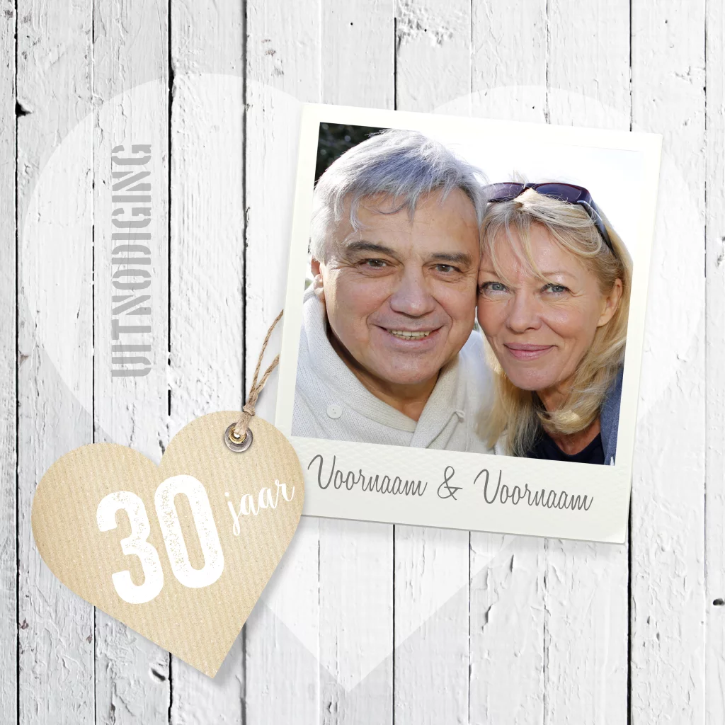 Mooie huwelijksjubileum uitnodiging voor 30 jaar met een eigen foto. Het jaartal is aanpasbaar. Met een wit houten achtergrond effect, een leuk hartje als label waarin je het jaar kan aanpassen.