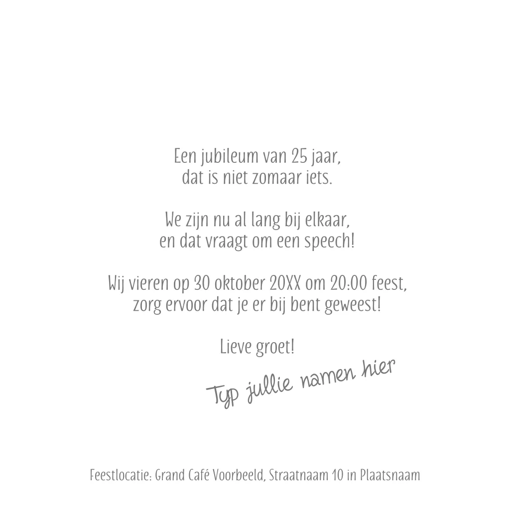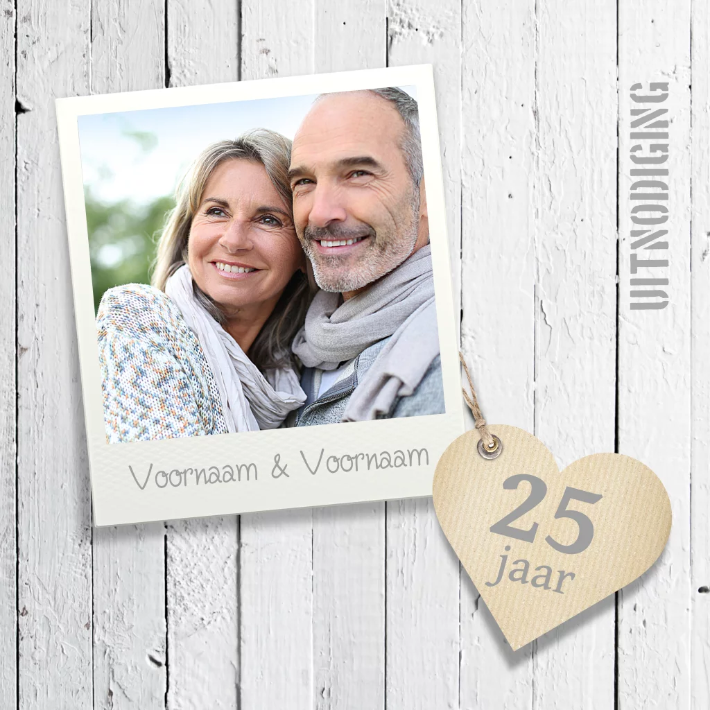 Stijlvolle uitnodiging voor jullie huwelijksjubileum, het jaartal is aanpasbaar. Met wit houten achtergrond print, je eigen foto in een frame en mooi labeltje in de vorm van een hartje.